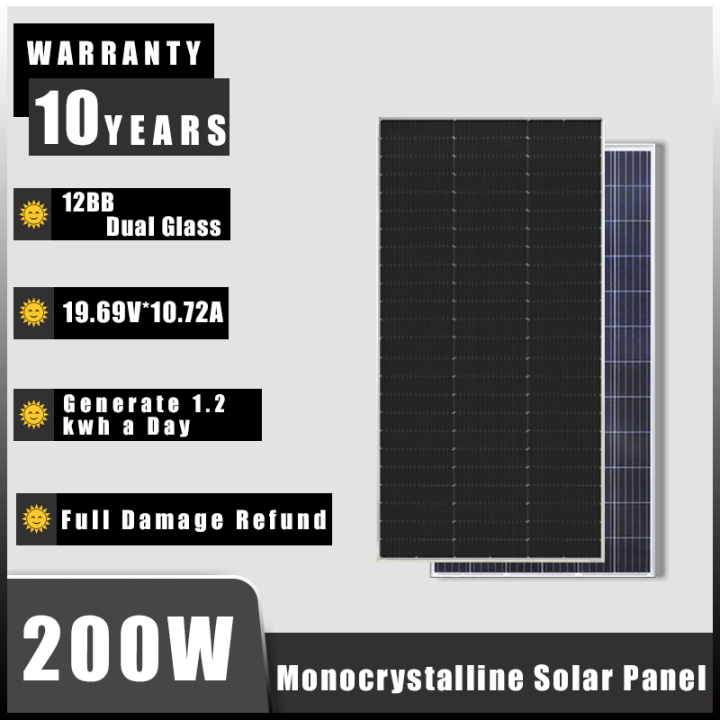 WUZECK Solar Panel Kit 12V 200W Lightweight 100Watt Monocrystalline PV Module with 20A Charge. This Renogy 200 Watt Solar Panel features an extended lifespan for outdoor use and high resistance against the wind (2400Pa) and snow (5400Pa) The Renogy 200 Watt 12 Volt Monocrystalline Solar Panel with PERC technology and half-cut cells includes a 10-year workmanship and 25-year 80% output warranty.